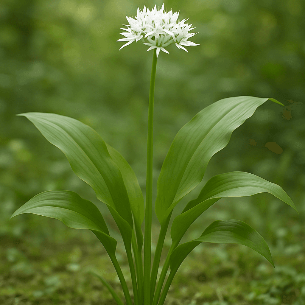 Bulbe vivace formant denses tapis odorants de 20-30 cm dans les sous-bois humides. Feuilles lancéolées vert vif à forte senteur d’ail, fleurs blanches étoilées nectarifères en ombelles printanières. Excellent couvre-sol comestible et mellifère, fixateur de nutriments et indicateur de sol riche en humus.