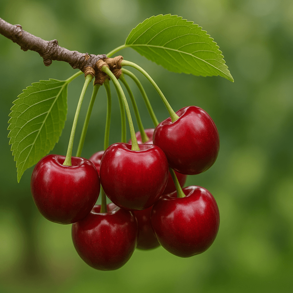 Grosse cerise rouge foncé 9 g, chair juteuse sucrée, noyau petit ; arbre à port érigé, fructification rapide (3 ans).