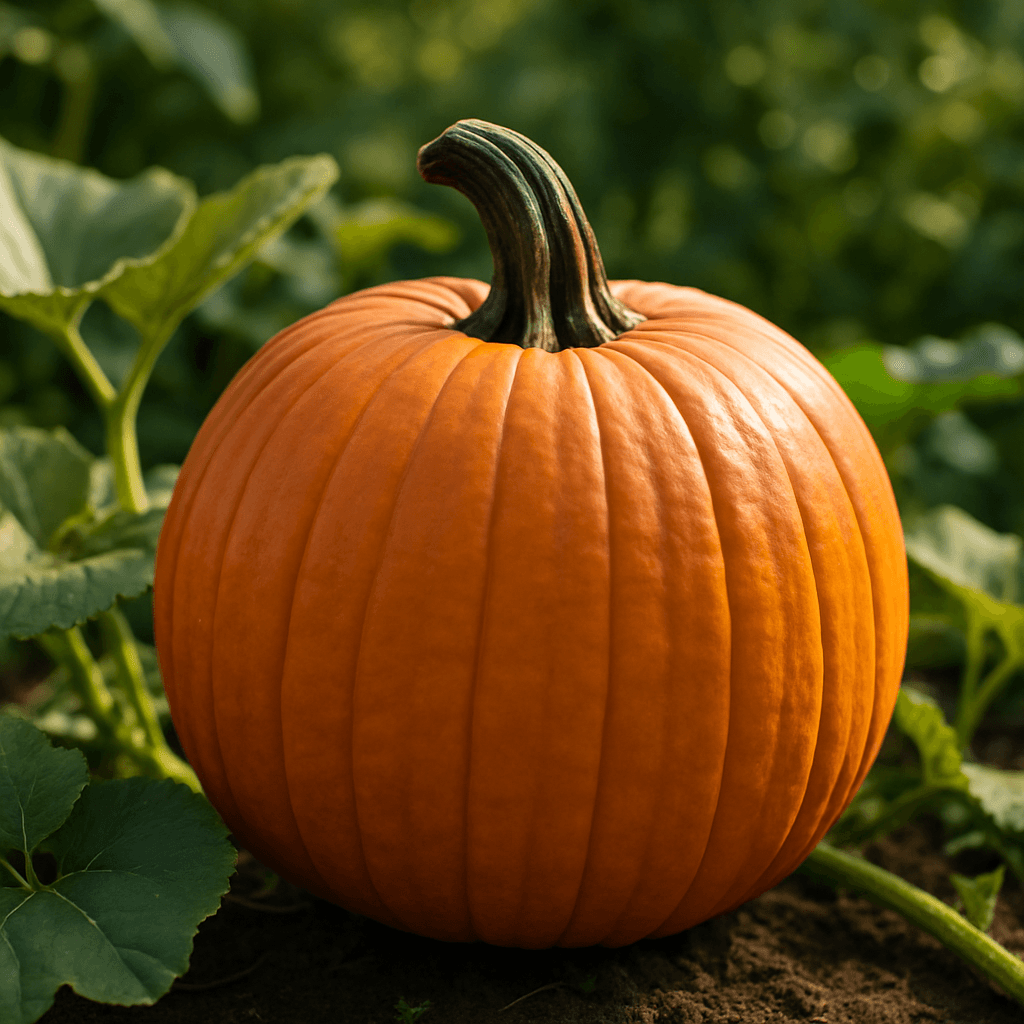 Citrouille orange intense de 8-12 kg, pédoncule robuste, chair jaune sucrée, variété standard pour marché d’automne.